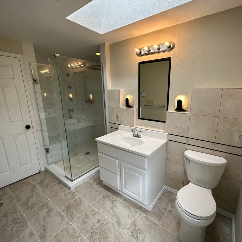 Our team of professionals is dedicated to delivering exceptional bathroom renovations that improve comfort, efficiency, and aesthetics. We offer a range of remodeling services, including custom tile work, modern lighting installations, smart storage solutions, sleek countertops, and elegant bathroom designs tailored to your needs. Whether you’re creating a spa-like retreat or a sleek, minimalist bathroom, Renova Build ensures the highest level of quality and craftsmanship in every project.